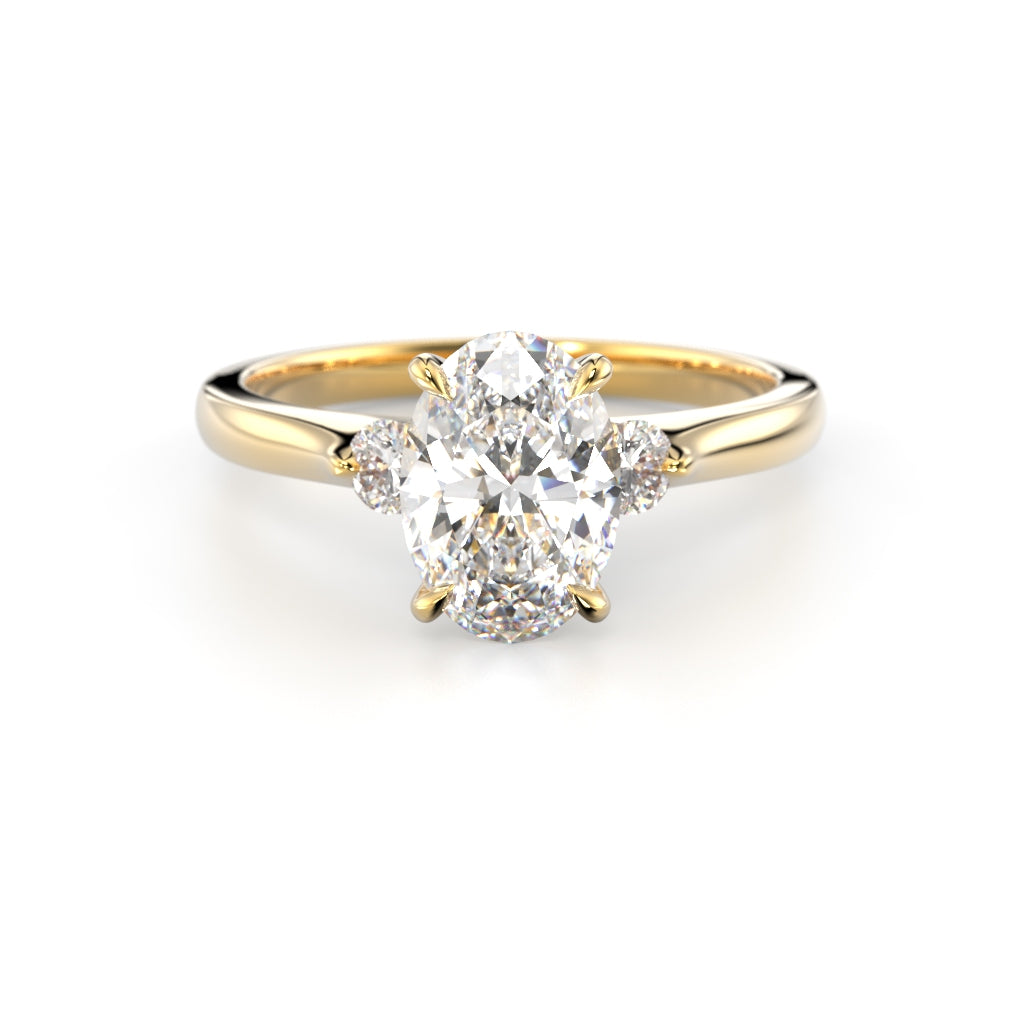 The lovely and trendy Festive Megan Oval diamond ring features an oval-cut diamond in the centre and two brilliant-cut diamonds on the sides. This ring can be worn on its own or paired with another ring. A perfect match especially for the Festive Juliettein-line and Auréa Band rings. The ring is available with genuine natural diamonds or with laboratory-prepared diamonds. The diamond quality menu says LAB MADE under laboratory diamonds. The ring includes a GIA certificate of authenticity for natural diamonds and an IGI certificate of authenticity for LAB MADE diamonds.