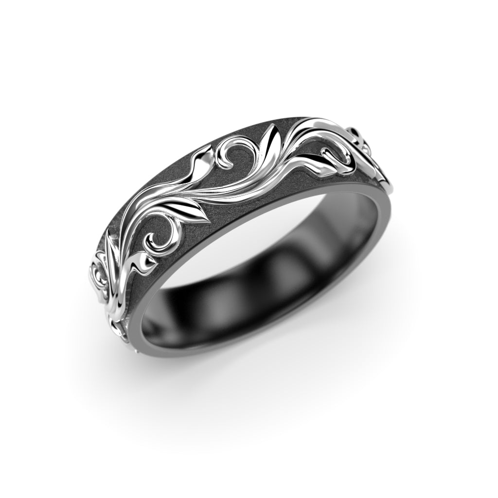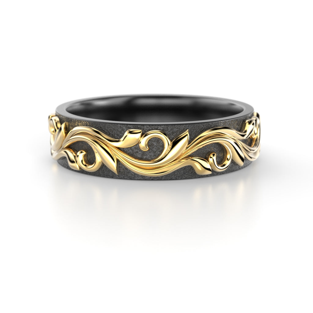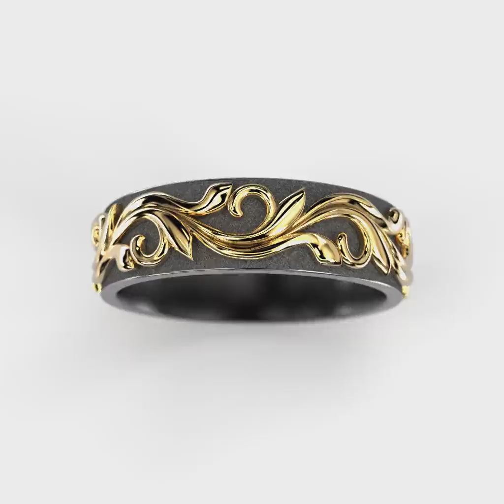 The Feeniks NOX ring is born from opposites. Feeniks draws its inspiration from nature and renewal. The vine pattern around the ring symbolises continuity, the cycle of life and sustainable growth. The detailed design brings organic strength and meaning to the ring. The deep, dark tone of zirconium and the warmth of gold highlight the strong union of the two materials. Thoughtful and meaningful, the Feeniks-Nox is unisex and designed to stand the test of time and wear.