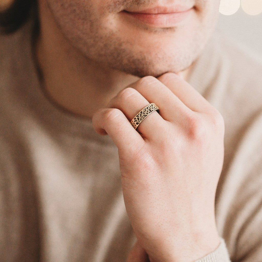 The Nexus ring is born of opposites. The deep dark hue of zirconium and the warm glow of gold meet in a timeless form - separate but inseparable. The Nexus is the connection and the nexus where the different elements meet and influence each other. This idea is reflected in the strong contrast and unique design of the ring. The unisex Nexus ring is designed to fit everyone and stand the test of time.